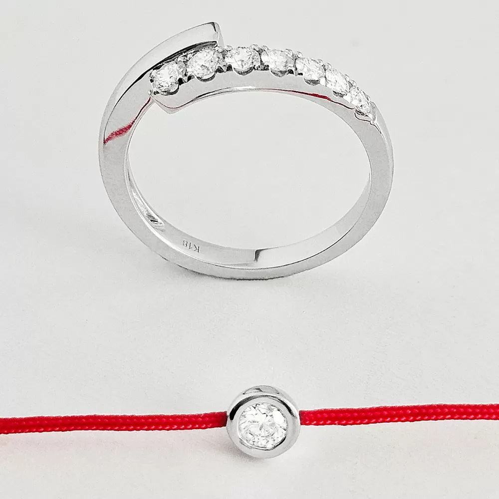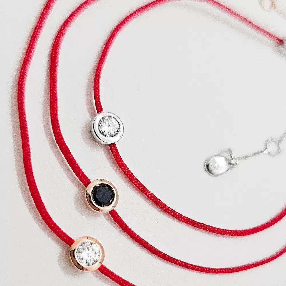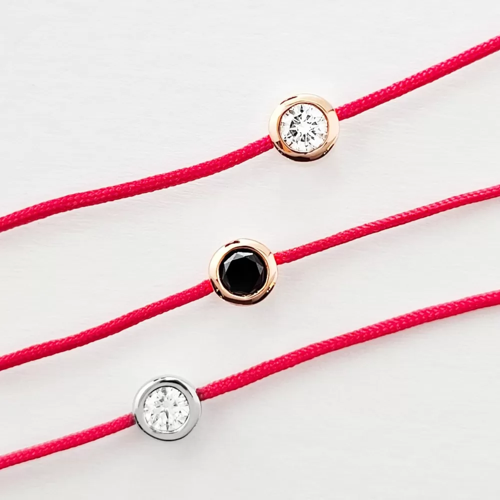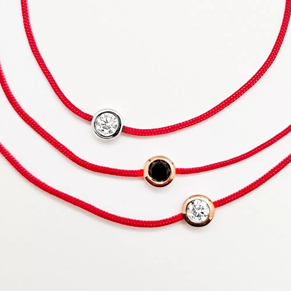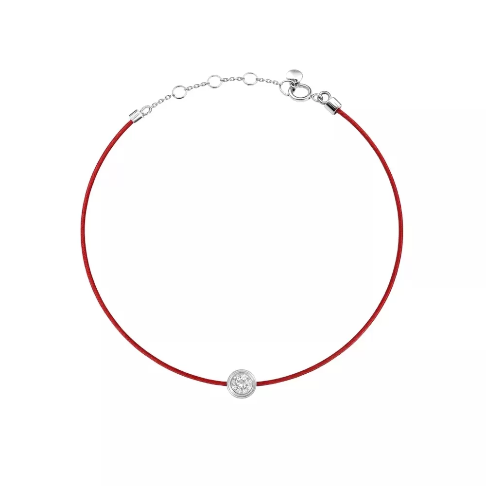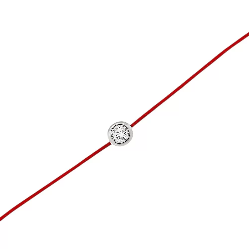Pulsera hilo rojo en oro blanco con diamante talla brillante.